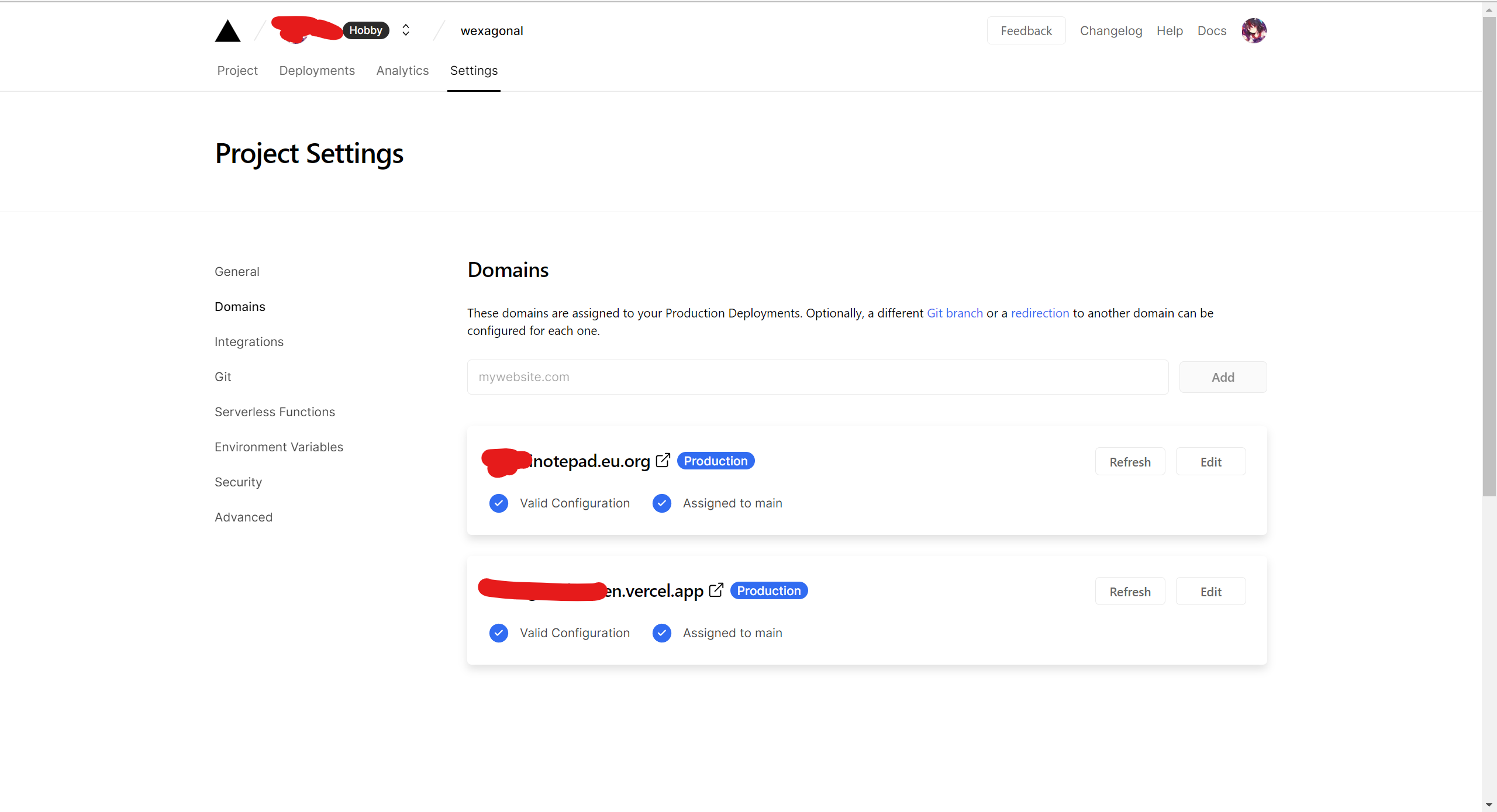 vercel 的后端部署界面->Settings->Domains->输入域名,点 Add