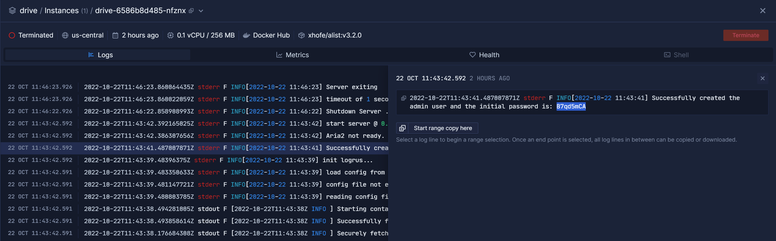 stderr F INFO[2022-10-22 11:55:32] start server @ 0.0.0.0:5244就代表部署成功,下方包含初始密码(注意不要复制多一个空格) - Shell 里输