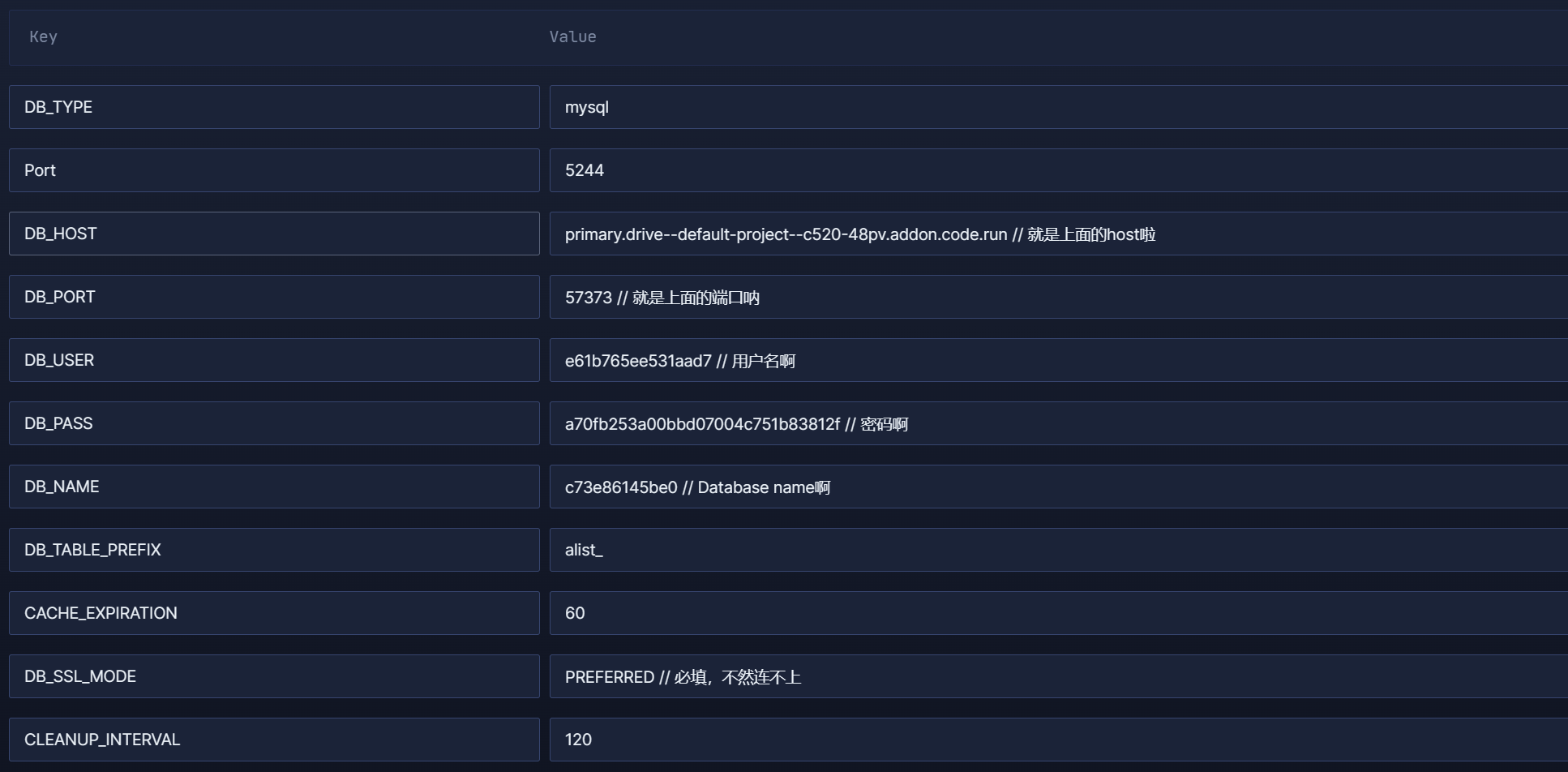 External image填上xhofe/alist:v3.2.0 Networking一项Port填5244,Protocol选HTTP, 勾上Publicly expose this port to the internet,你会得到一个公开域名,长得像p01--drive--xxxxxxxxx.code.run